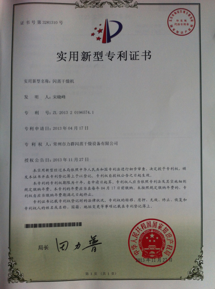 由我公司申請的“閃蒸干燥機”通過國家知識產權局的審核,并取得實用新型專利證書,閃蒸干燥機專利號是:2013 -2-0196574.1